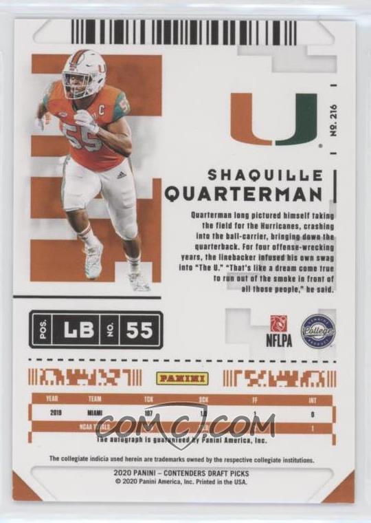 2020 Panini Contenders Draft Picks Cracked Ice #216 Shaquille Quarterman AU
